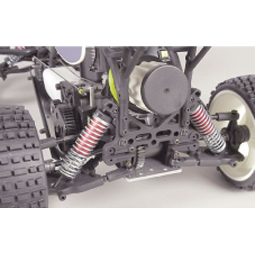 Spécifications techniques : Le chassis alu de 4mm est plié sur les cotés pour une meilleure rigidité, les vis sont à tête fraisées sous le chassis et n'accrochent pas le sol. Le train Avant permet de régler le pincement à l'aide des biellettes de direction. Les suspensions à double triangulation, sont secondées par des amortisseurs hydrauliques à volume constant, pour une tenue de route optimale. Les pièces de transmissions (cardans, noix, couronnes, pignons, etc..) en acier sont traités pour une longévité accrue. Les bavettes et la carrosserie entièrement englobante protègent la platine, le réservoir, le moteur des projections. La carrosserie et l'aileron sont en ABS blanc, les pneus sont montés et collés sur les jantes.
