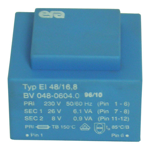 Transformateur moulé,pour CI.Primaire:230 Vac,50/60 Hz.Secondaire:0 / 8 Vac,0,9 VA + 0 / 26 Vac,6,1 VA.Dim.:50 x 42 x 34mm.