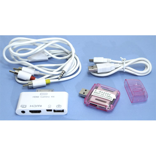 HDMI connection kit for iPad. Support HDMI 780/1080P pour iPad1/iPad2/iPhone 4G/ iTouch 4. Adaptateurs:jack 3,5 4 contacts femelle/HDMI femelle/Mini USB femelle/USB A femelle + adaptateur USB A mâle > lecteur carte SD/Micro SD.