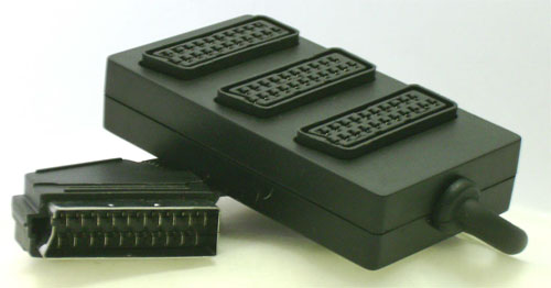 MULTIPRISE PERITEL 3 ENTREES FEMELLE >> 1 SORTIE MALE.-NECESSITE DE METTRE EN LECTURE 1 SEUL APPAREIL A LA FOIS.-REF.:012003.