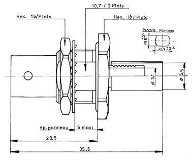 - Fiche femelle mont. arrière- Fréquence 0 à 1,5GHz- Tension Veff 500- Type 50s- Température -65 à +165 °C- Pour câbles Ø 5 mm KX15, RG141 ou RG58 - Isolement 5000 MOhms.- *PE = presse étoupe.Téléchargement : Fiche Technique
