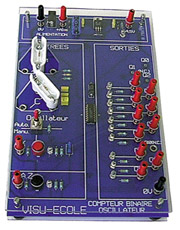Module basé sur un CI 4060, très pratique pour mettre en oeuvre des bases de temps ou des minuteries. L'oscillateur est réglable par 3 résistances et 3 condensateurs; une action manuelle est prévue. Une Led visualise l'état de chacune des 10 sorties. Des douilles permettent d'effectuer toutes les mesures utiles.